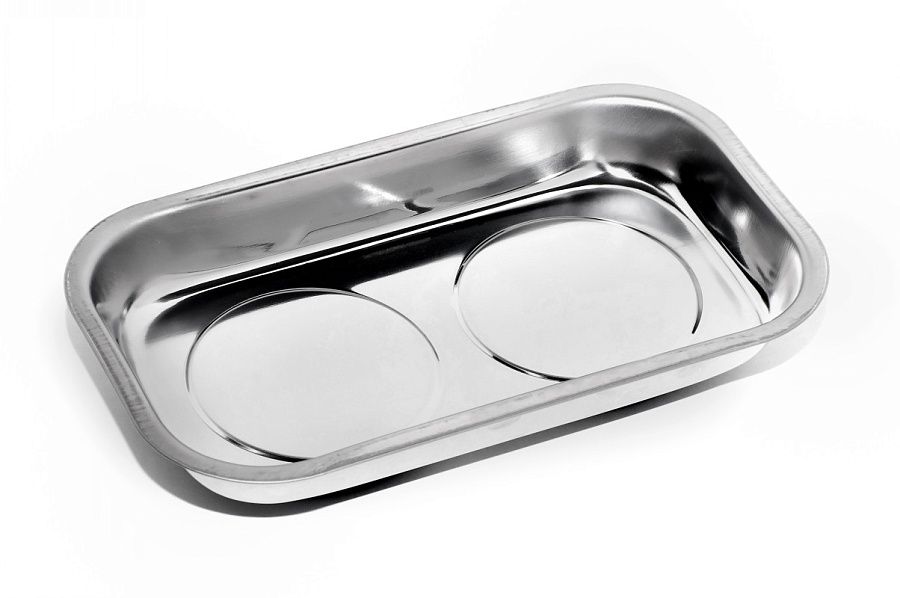 Лоток изготовлен из нержавеющей стали, что препятствует образованию коррозии. Удобен при работе с различными агрегатами позволяет надежно хранить демонтированный крепеж.